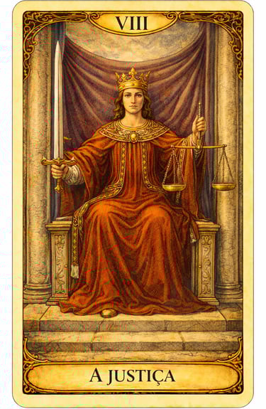 A carta A Justiça representa equilíbrio, verdade e responsabilidade no Tarot. Ela simboliza a lei universal de causa e efeito, lembrando que todas as escolhas e ações possuem consequências.