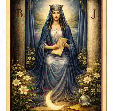 No simbolismo do Tarot, ela aparece sentada entre dois pilares, representando o equilíbrio entre forças opostas e o acesso ao conhecimento oculto. Sua presença lembra que existe um mundo invisível além daquilo que percebemos com os sentidos.